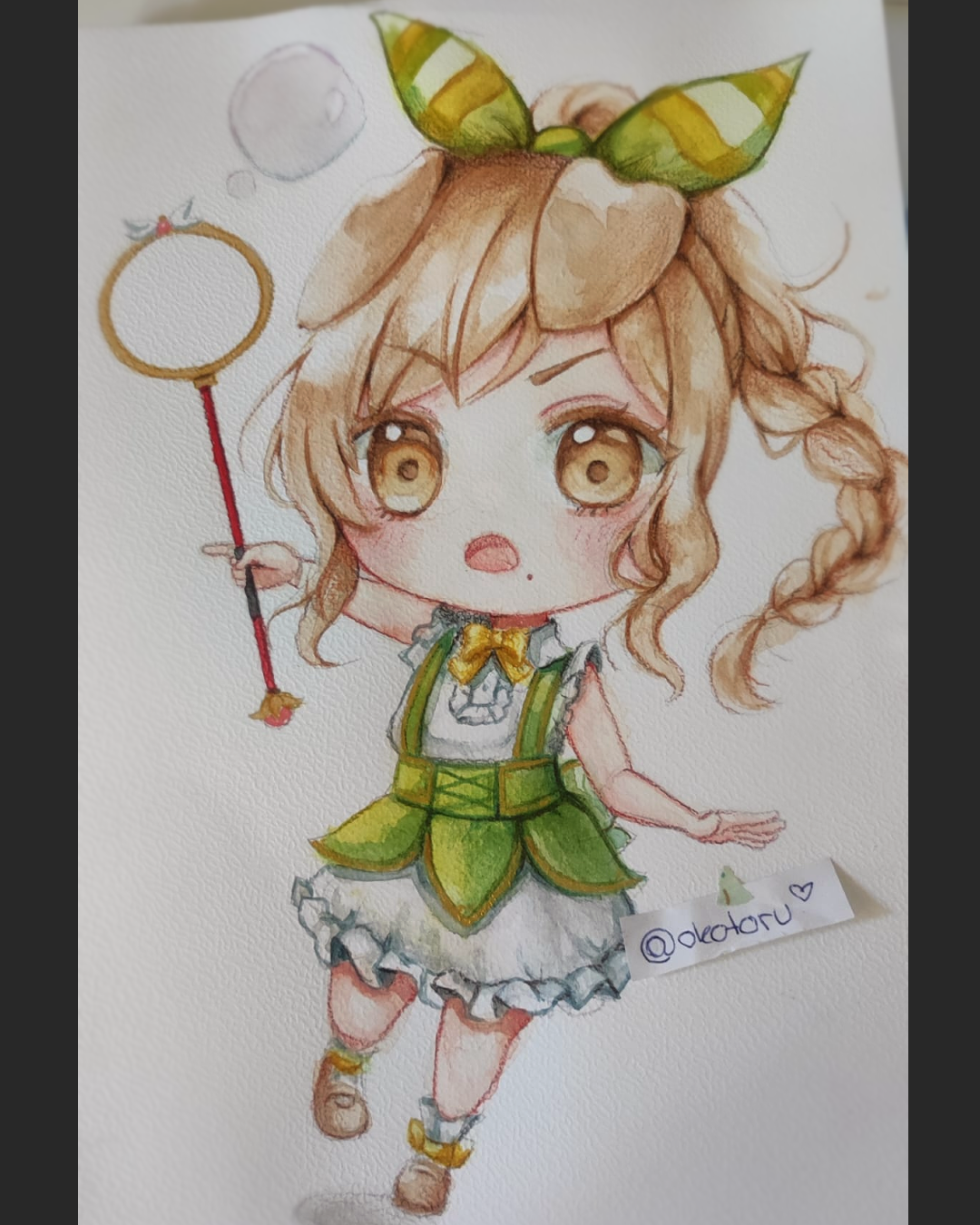 Her long, light brown hair is usually styled in a braided ponytail, secured with a cheerful bow featuring white, yellow and green stripes.